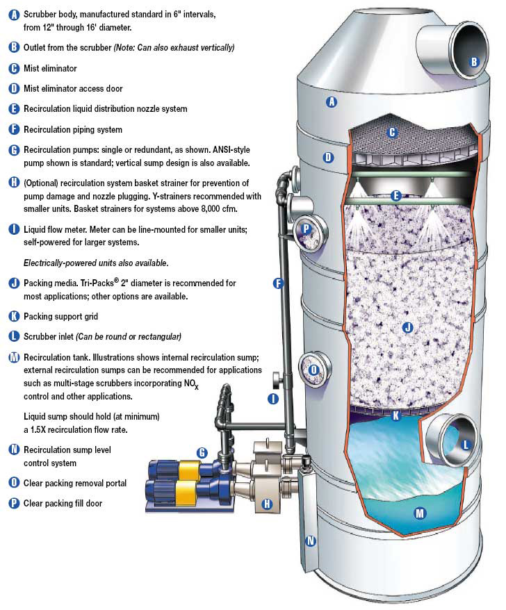 BATS packed bed scrubbers are versatile, reliable systems that serve the widest variety of processes. BATS packed scrubbers are highly recommended for the efficient removal of inorganic gases, odors and fumes, and are particularly appropriate where gas streams have extreme pH. They are well suited for use as primary or secondary systems in conjunction with thermal oxidizers, and are also used in a series where there are multiple-contaminant gas streams.